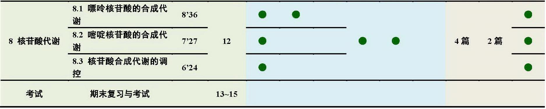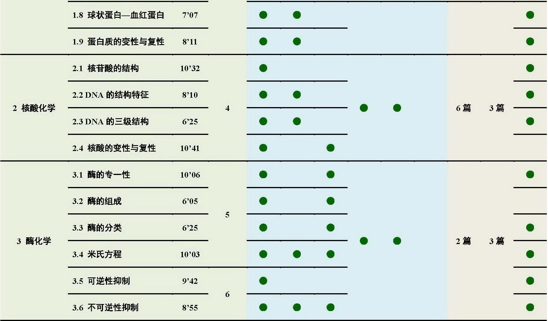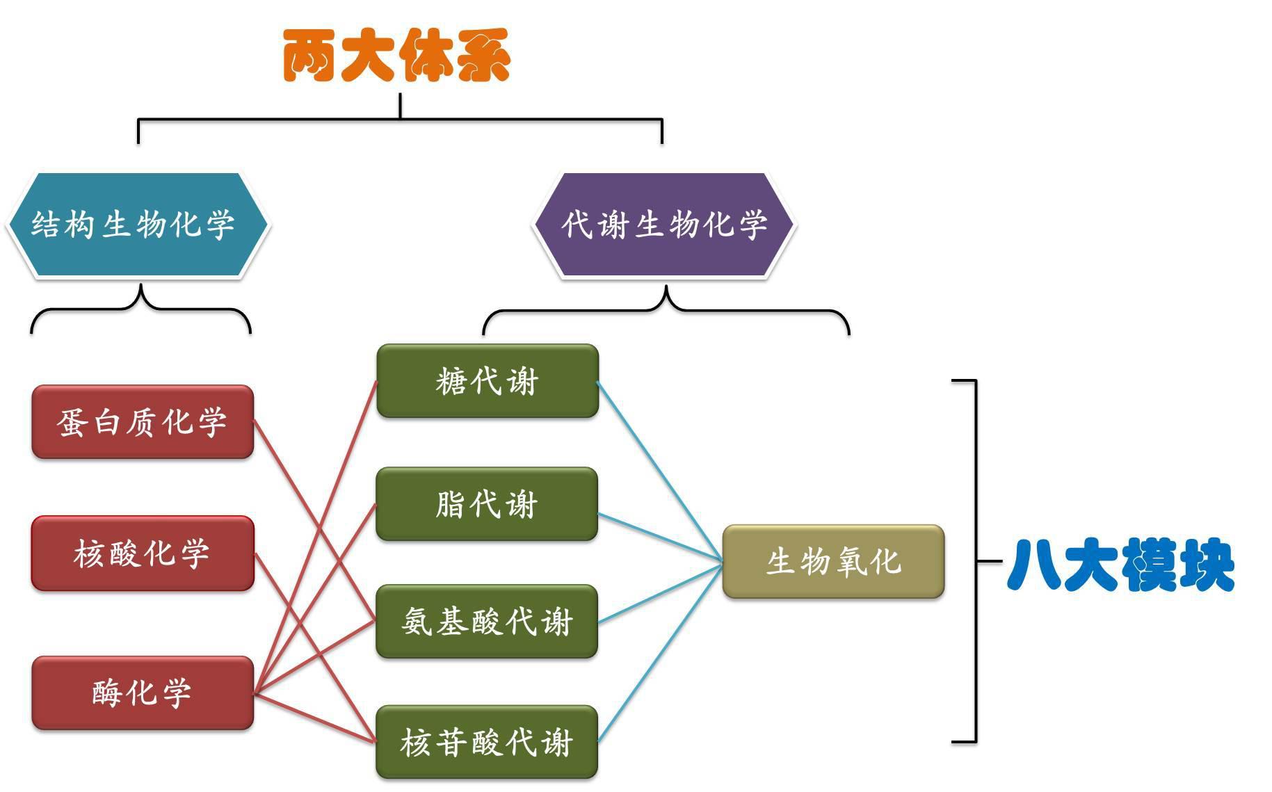 本着降低结构生物化学比重、弱化分子生物学内容、突出代谢生物化学地位的原则,本课程共设置 8 章,包括结构生物化学 3 章和代谢生物化学 5 章,共计 50 个知识点。结构生物化学包括蛋白质化学、核酸化学和酶化学,介绍包括氨基酸、肽、蛋白质、核酸、酶的结构、生理功能,蛋白质、核酸一级结构与高级结构的关系,蛋白质物质结构与功能之间的关系,酶促反应动力学特征等内容。代谢生物化学是本课程重点内容,包括化学渗透假说机制,生物氧化类型,糖酵解、三羧酸循环、糖异生、脂肪酸 β- 氧化、脂肪酸合成、氨基酸分解、核苷酸合成等代谢途径关键酶及生理意义。通过运用结构和代谢生物化学原理和方法,理解生命过程中所发生的现象;运用代谢生物化学的原理和方法,理解代谢异常与疾病的关系。具体安排如下。
