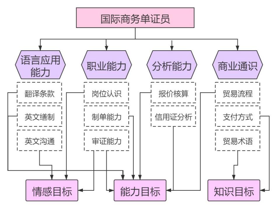 本课程按照应用型人才培养目标要求,实行“专业+外语+现代技能”的才培养模式,培养具备国际商务单证员岗位要求的专业知识、职业素质和岗位能力的应用型商务人才。课程开设在《国际贸易实务》之后,学生已经掌握了国际贸易的基础知识及基本操作流程,为本课程的学习奠定了扎实的理论基础。本课程立足国际商务单证员岗位需求,以岗位职业能力为导向,要求学生通过学习应达到以下目标: