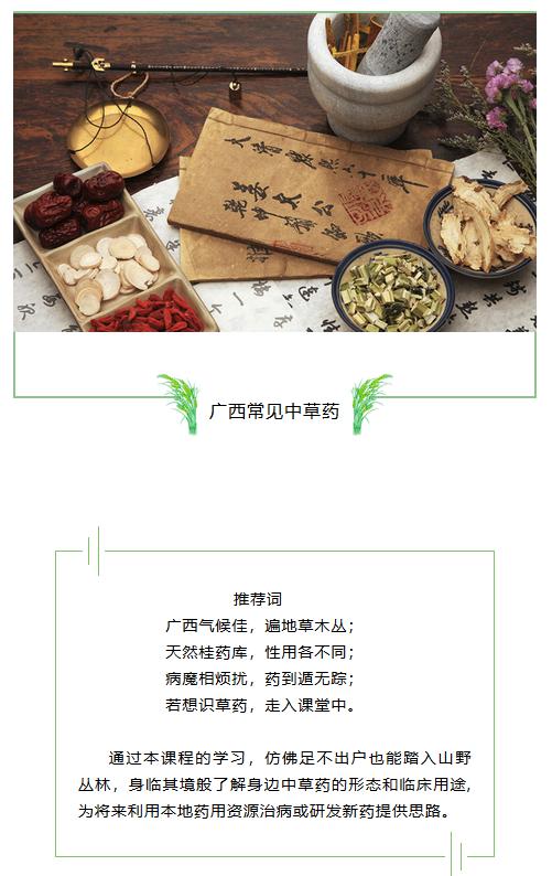 此外,由于本课程系统涵盖了中草药的基本理论和应用原则,而收录的具体药物虽然以广西常见中草药为主,但部分中草药在全国各地也有分布,故《广西常见中草药》也适合区外各高校或社会人士选择修读。