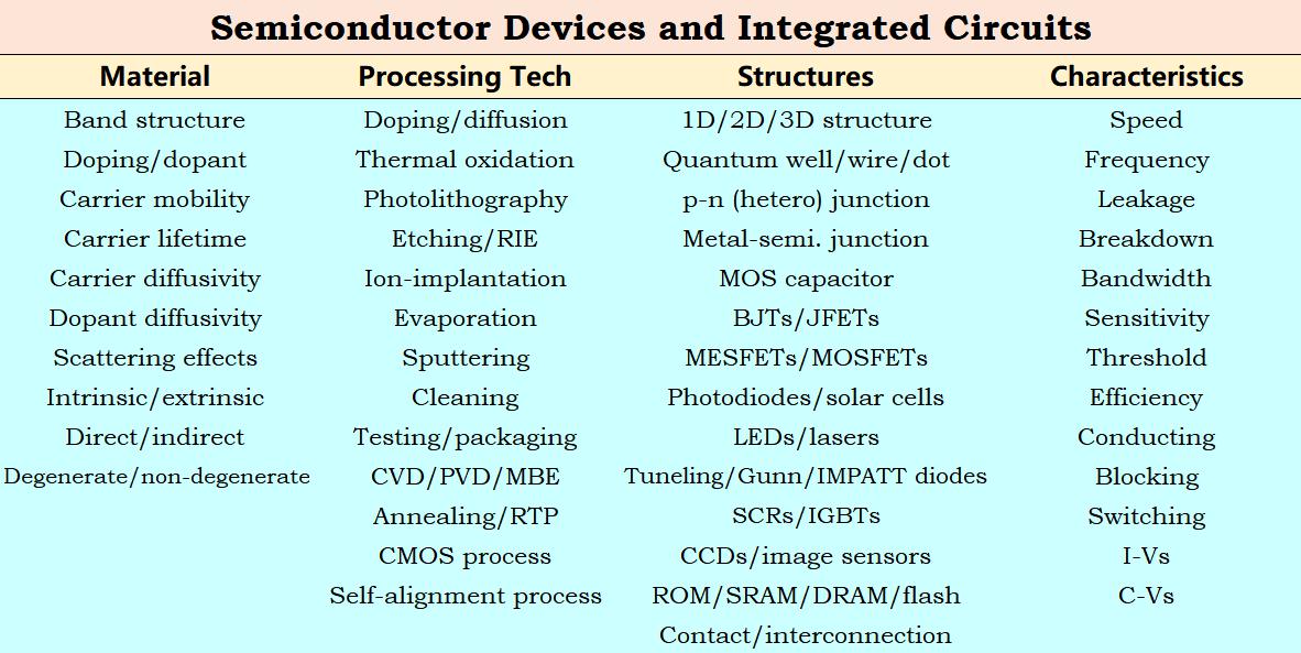 本课程教学内容涵盖所有器件大类,系统讲解各类器件的器件结构、工作原理、器件特性以及器件物理效应,包括: