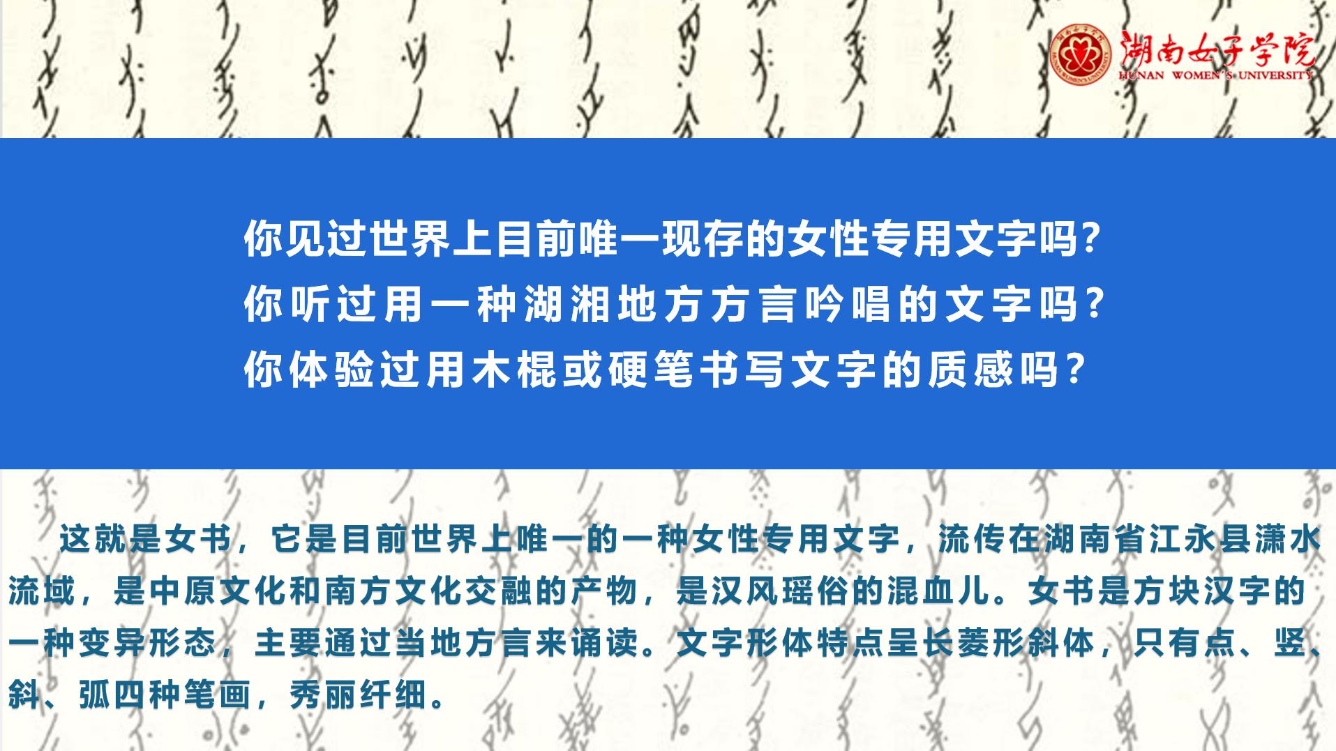 《女书文化概论》是由湖南女子学院结合女书本土化,遵循女书原汁品质,多方借力倾力打造一门多维度、多元化的女校特色通识课程,涵盖女书与女校情缘、女书与中国妇女群体写作、女书与湖湘妇女、女书与本土化记忆、女书与非遗保护、女书与传承创新等相关模块,由多名女书传人、女书研究者和女书传播者分享。这门课程具有理论性、科学性和实践性等特点,激发和培养大学生女性自我意识,具有培育女性四自精神通识教育的作用。遵循非遗保护传承的原则,用“见人见物见生活”的活态形式集中展示女书,推动非遗融入生活,弘扬湖湘优秀传统文化,通过传承与创新,彰显女性的智慧、美丽、包容与自信的形象。