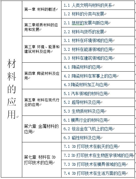 本门课程结合人类文明和生产结束的发展,将学习内容分三个模块进行介绍,模块一:介绍人类文明与材料的关系入手,介绍材料的分类和发展,模块二:讲述材料在传统行业中的应用,包括纸质材料的应用、陶瓷材料的应用和环境材料的应用,模块三:讲述材料在现代行业中的应用,包括材料在汽车领域的应用,模具领域的应用和飞机领域的应用,最后讲述材料在3D打印技术的应用,包括3D打印技术在航天,模具,生物医疗和日常生活方面的应用