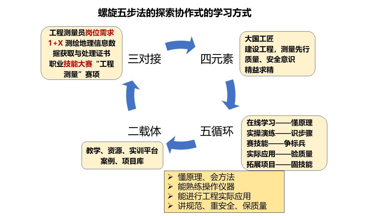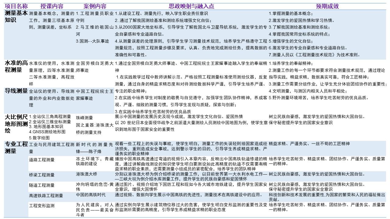 基于“岗课赛证”,融通育人的思想,把“工程测量员”岗位,全国职业院校技能大赛和“1+X”测绘地理信息数据获取与处理职业资格证书中的能力需求,核心素养等加以组合,凝练思政元素,融入课程内容。围绕真实项目,将GNSS测量技术、无人机测绘技术、GIS三维建模与分析等现代空间信息新技术融入,设计测量基本知识、水准的高程测量、导线测量、大比例尺地形图测绘、专业工程测量等五个项目,开发由简单到复杂,由专项技能到综合技能,环环相扣的实践任务型的教学内容。以建设工程,测量先行为主线,系统设计课程思政点:精益求精,吃苦耐劳,责任与安全意识。形成以知识传授为基础环节,以能力培养为关键环节,以价值观塑造为根本环节,节节贯通、齐头并进的全面育人模式。