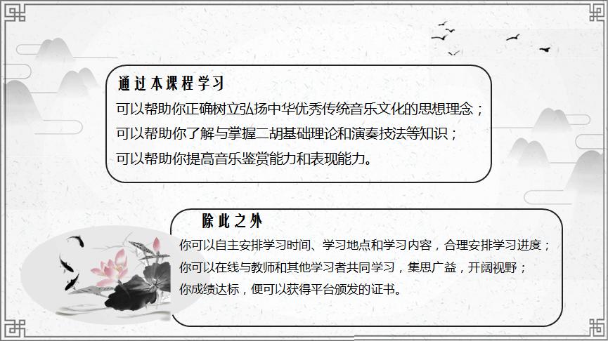 本课程以精要、系统化的教学内容,助推新形势下的课程教学改革与国乐传播。通过历史人文的解读、乐器演奏的学习、名曲艺术的表现、非遗胡琴的传承四大版块,构成多维化课程结构体系,是一门全新理念的国乐推广专业课程。